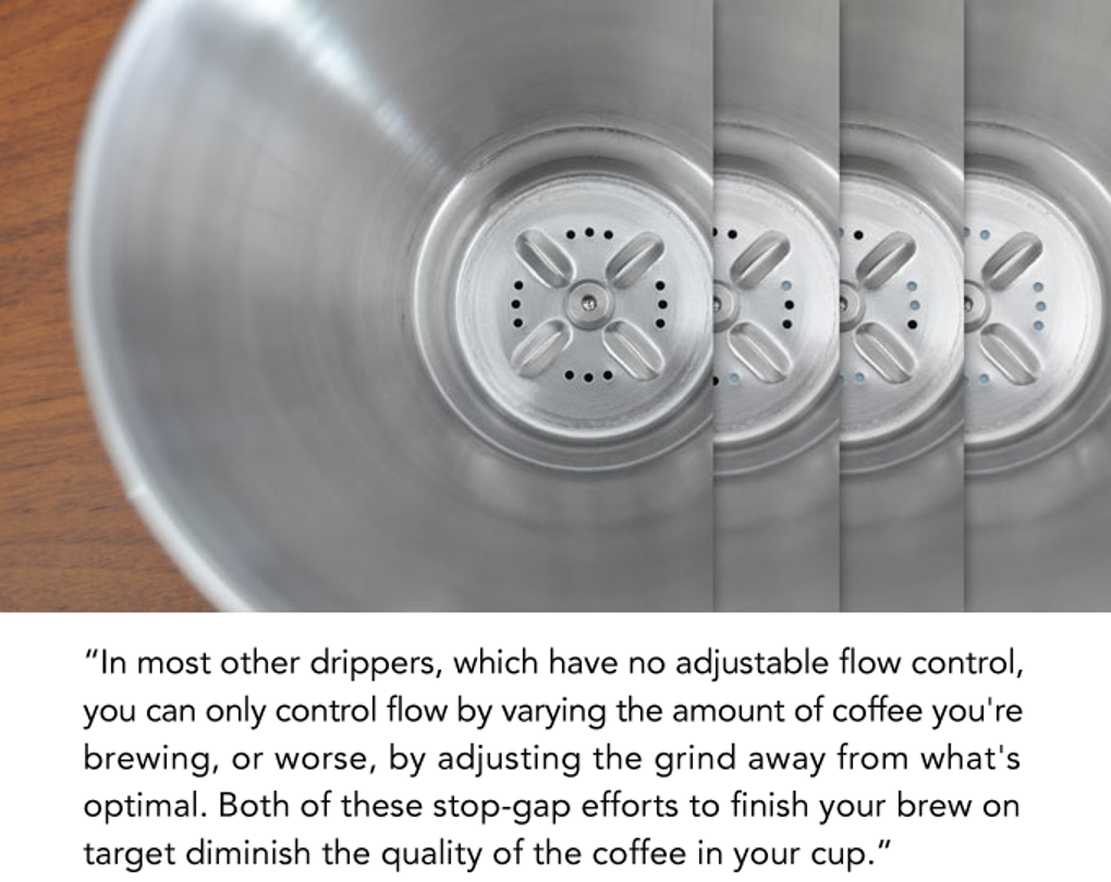 Die wichtigste Neuerung des December Dripper ist eine Basis mit variabler Öffnung. Durch die Möglichkeit, die Anzahl der Öffnungen an der Unterseite des Tropfers zu ändern, können Sie den Wasserfluss durch den Tropfer verlangsamen und so Ihre gewünschte Brühzeit konstant erreichen. Bei den meisten anderen Tropfern, die keine einstellbare Durchflussregelung haben, können Sie den Durchfluss nur steuern, indem Sie die Menge des gebrühten Kaffees variieren oder, schlimmer noch, indem Sie den Mahlgrad vom optimalen Wert abweichen lassen. Beide dieser Notbehelfe, um Ihren Brühvorgang wie gewünscht abzuschließen, mindern die Qualität des Kaffees in Ihrer Tasse. Warum sollten Sie eine teure Tüte Spezialitätenkaffee kaufen, wenn Sie nicht jedes Mal einen großartigen Aufguss erhalten? Selbst die erfahrensten Baristas sind durch die Grenzen traditioneller Übergieß-Tropfer eingeschränkt.