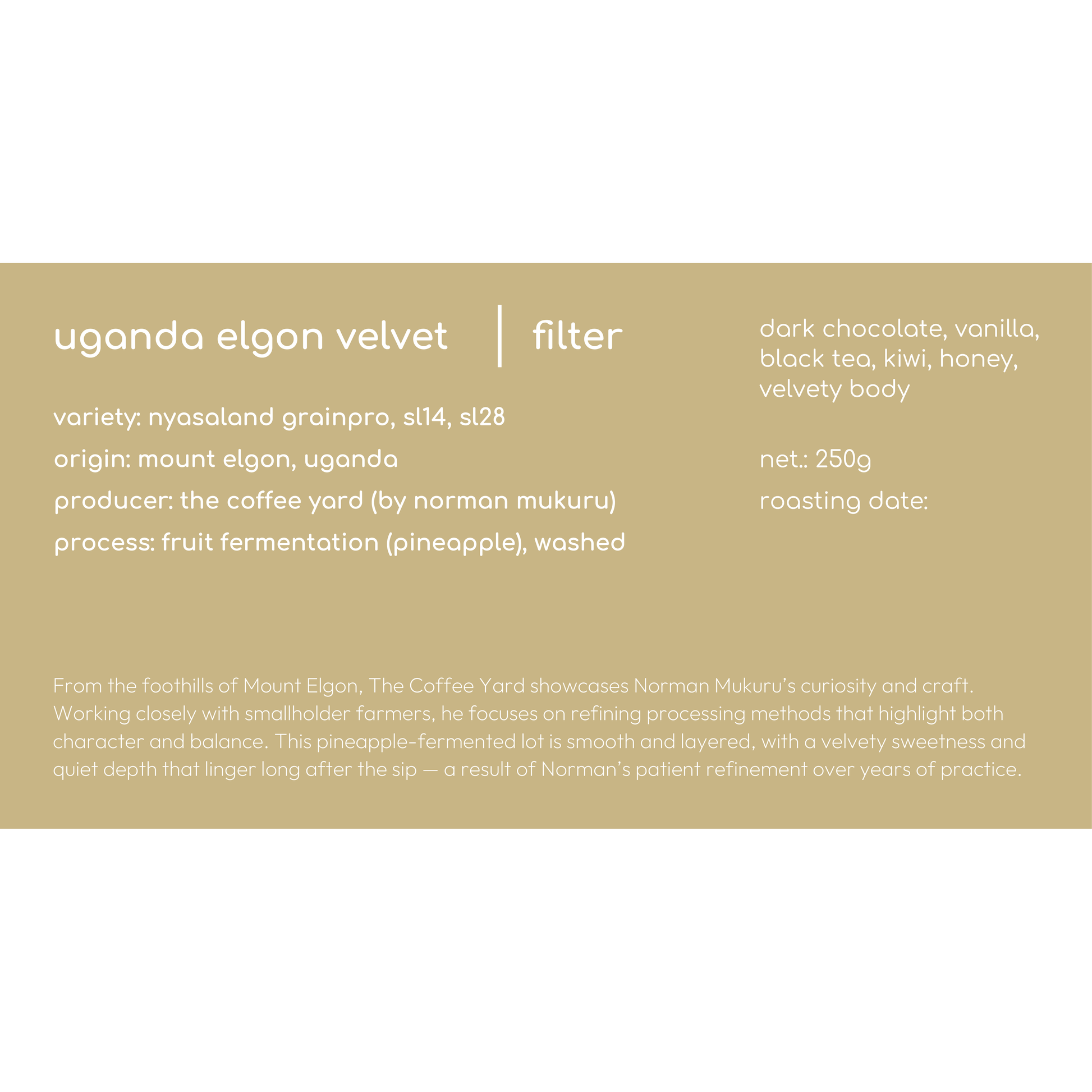 This coffee comes from the foothills of Mount Elgon in eastern Uganda, where Norman Mukuru and his team at The Coffee Yard work with farmers across the districts of Sironko, Mbale, Bulambuli, and Kapchorwa. With nearly 20 years of experience in coffee, Norman founded The Coffee Yard as a central hub for processing and drying cherries from the surrounding highlands.